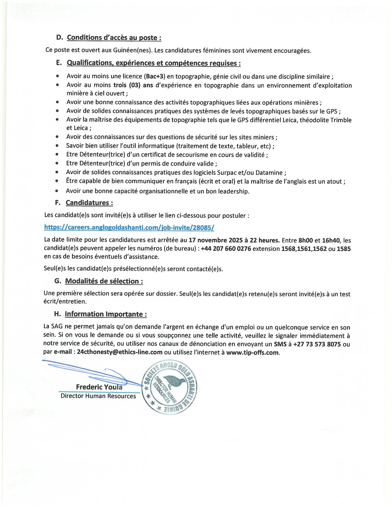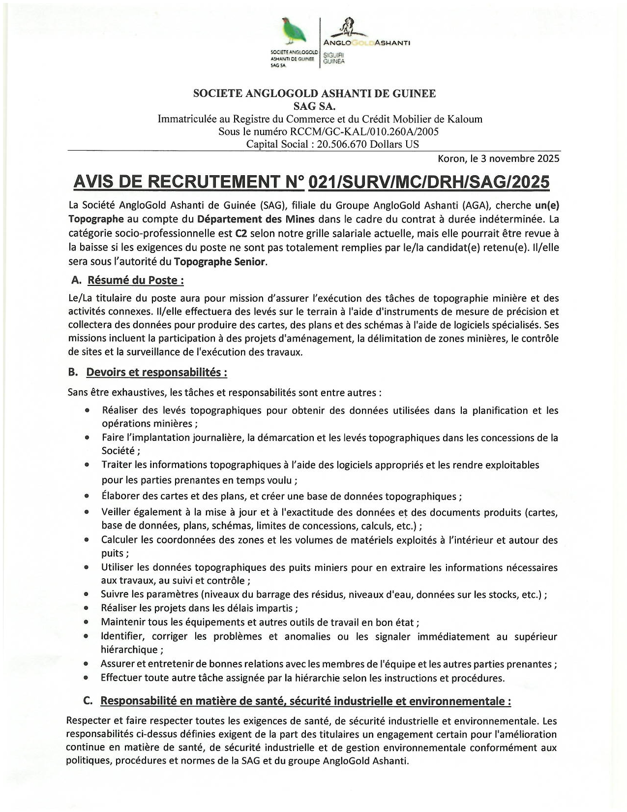 > Avis de recrutement d'un(e) Topographe au compte du Département des Mines dans le cadre du contrat à durée indéterminée.
