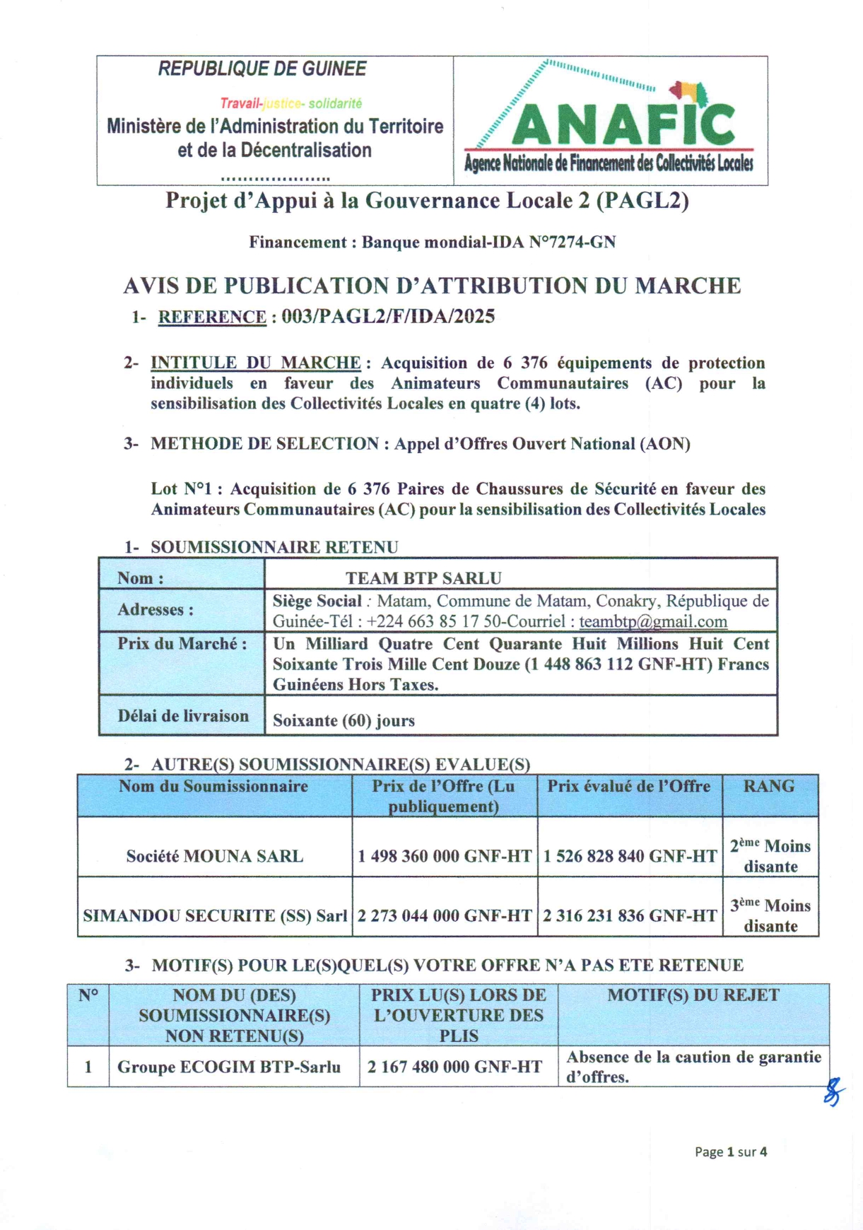 > PUBLICATION NOTIFICATION D'INTENTION D'ATTRIBUTION : Acquisition de 6 376 équipements de protection individuels en faveur des Animateurs Communautaires (AC) pour la sensibilisation des Collectivités Locales en quatre (4) lots