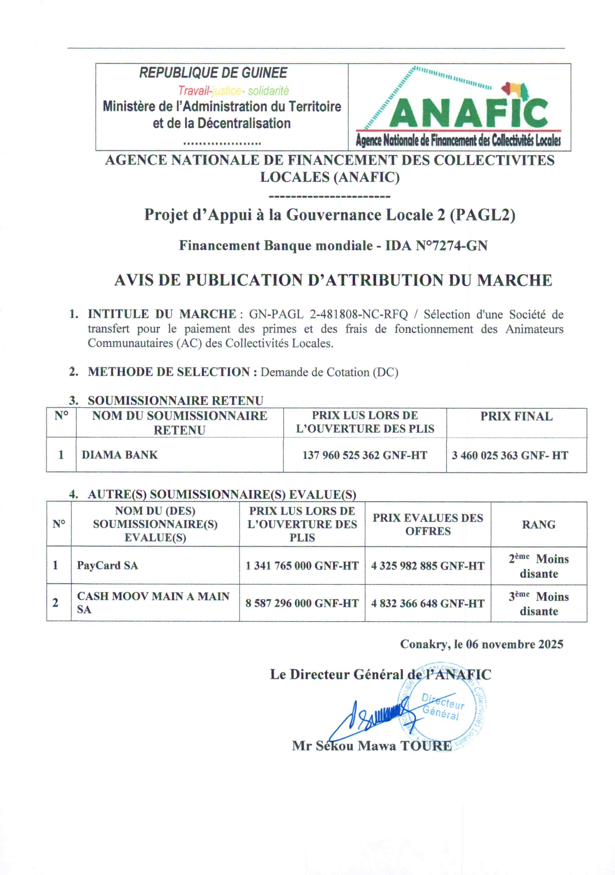 > PUBLICATION NOTIFICATION D'INTENTION D'ATTRIBUTION: Sélection d'une Société de transfert pour le paiement des primes et des frais de fonctionnement des Animateurs Communautaires (AC) des Collectivités Locales