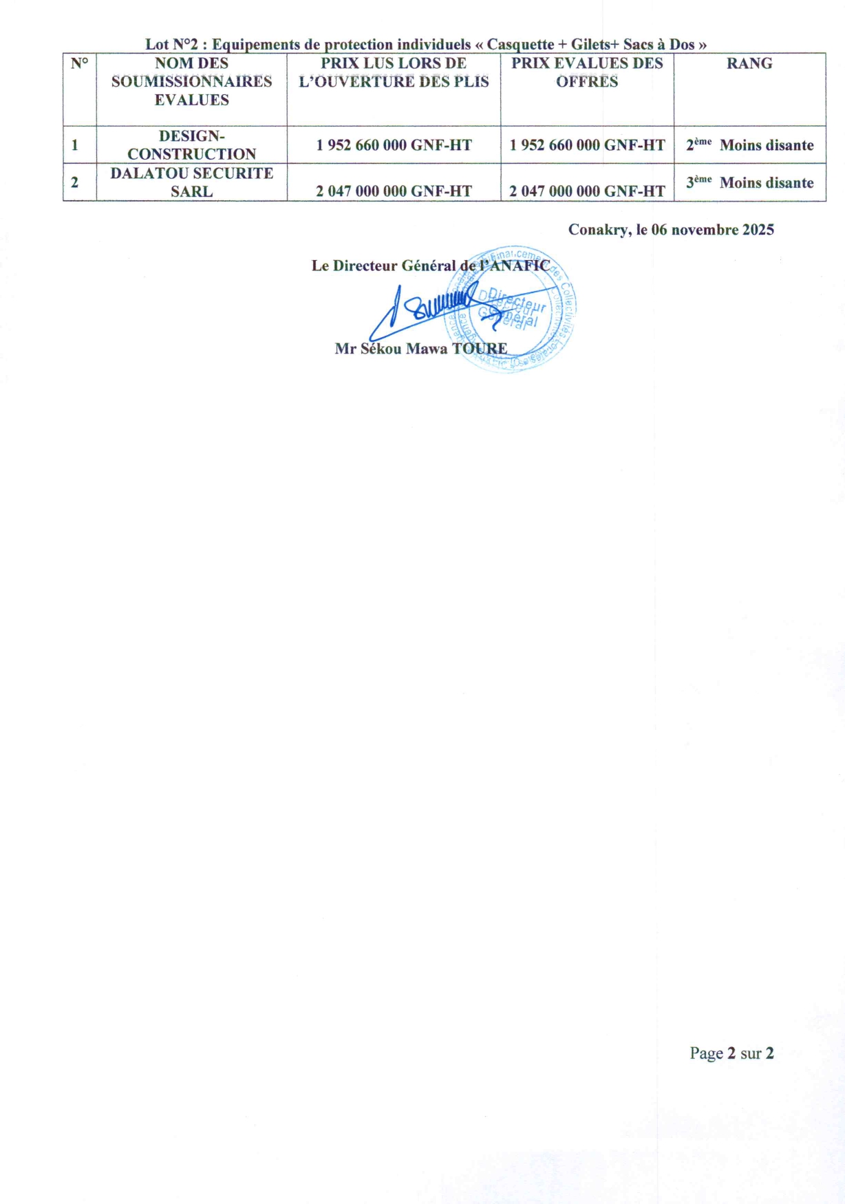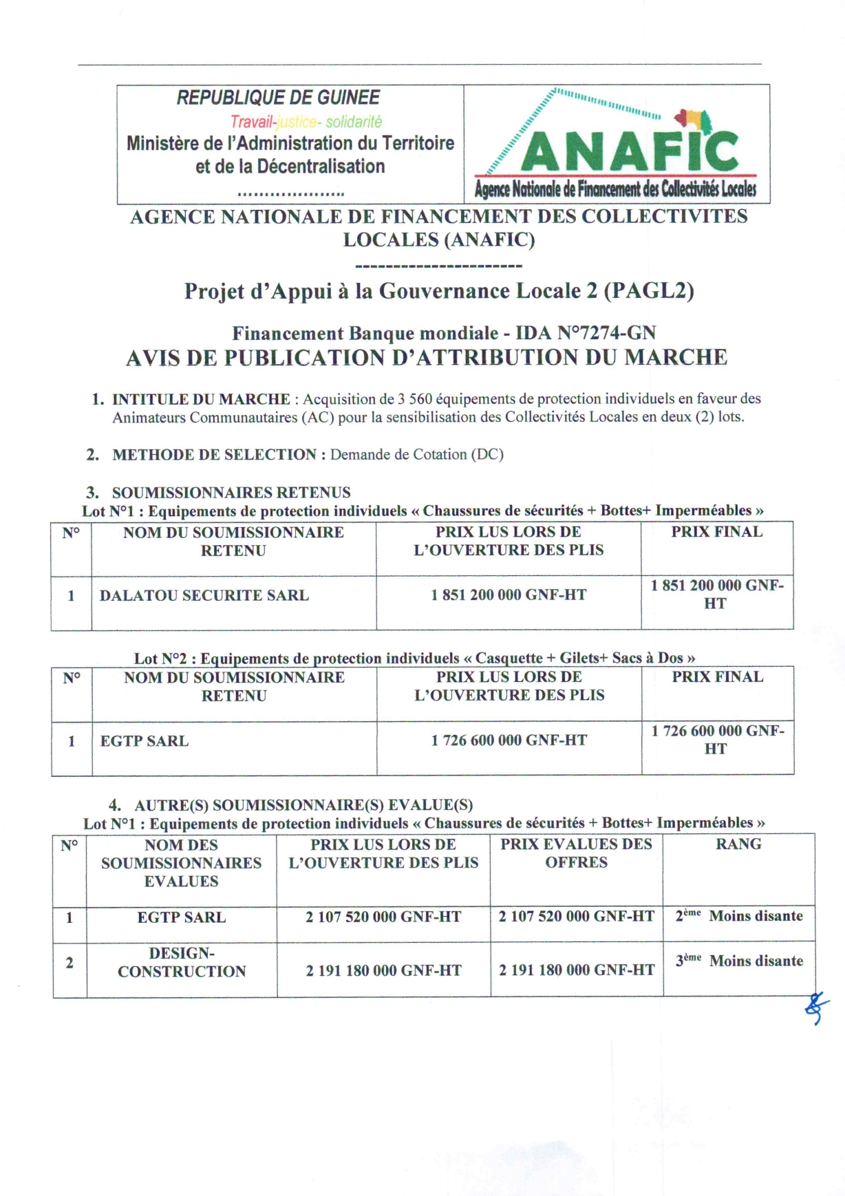 > PUBLICATION NOTIFICATION D'INTENTION D'ATTRIBUTION : Acquisition de 3 560 équipements de protection individuels en faveur des Animateurs Communautaires (AC) pour la sensibilisation des Collectivités Locales en deux (2) lots