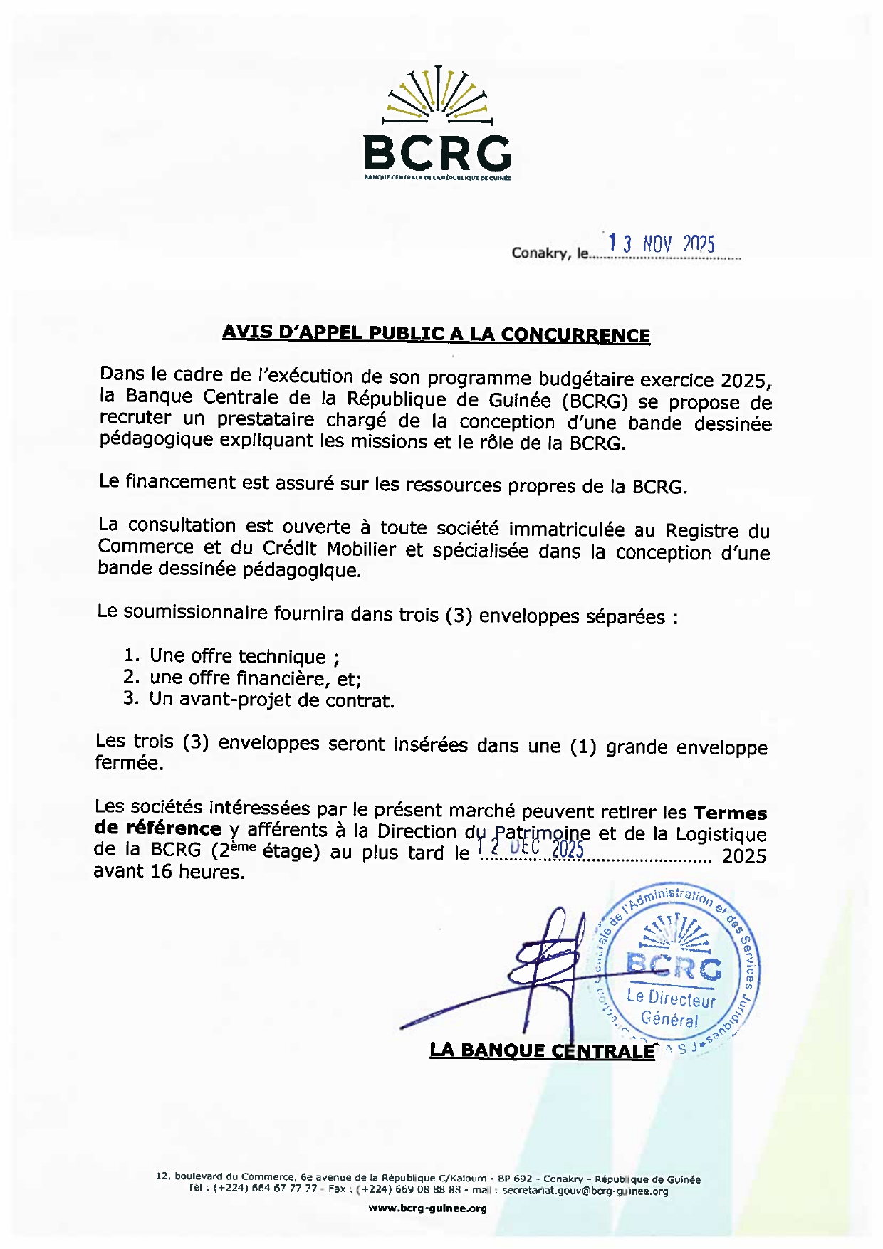 > Avis d'appel d'offres pour le recrutement d'un prestataire chargé de la conception d'une bande dessinée pédagogique expliquant les missions et le rôle de la BCRG